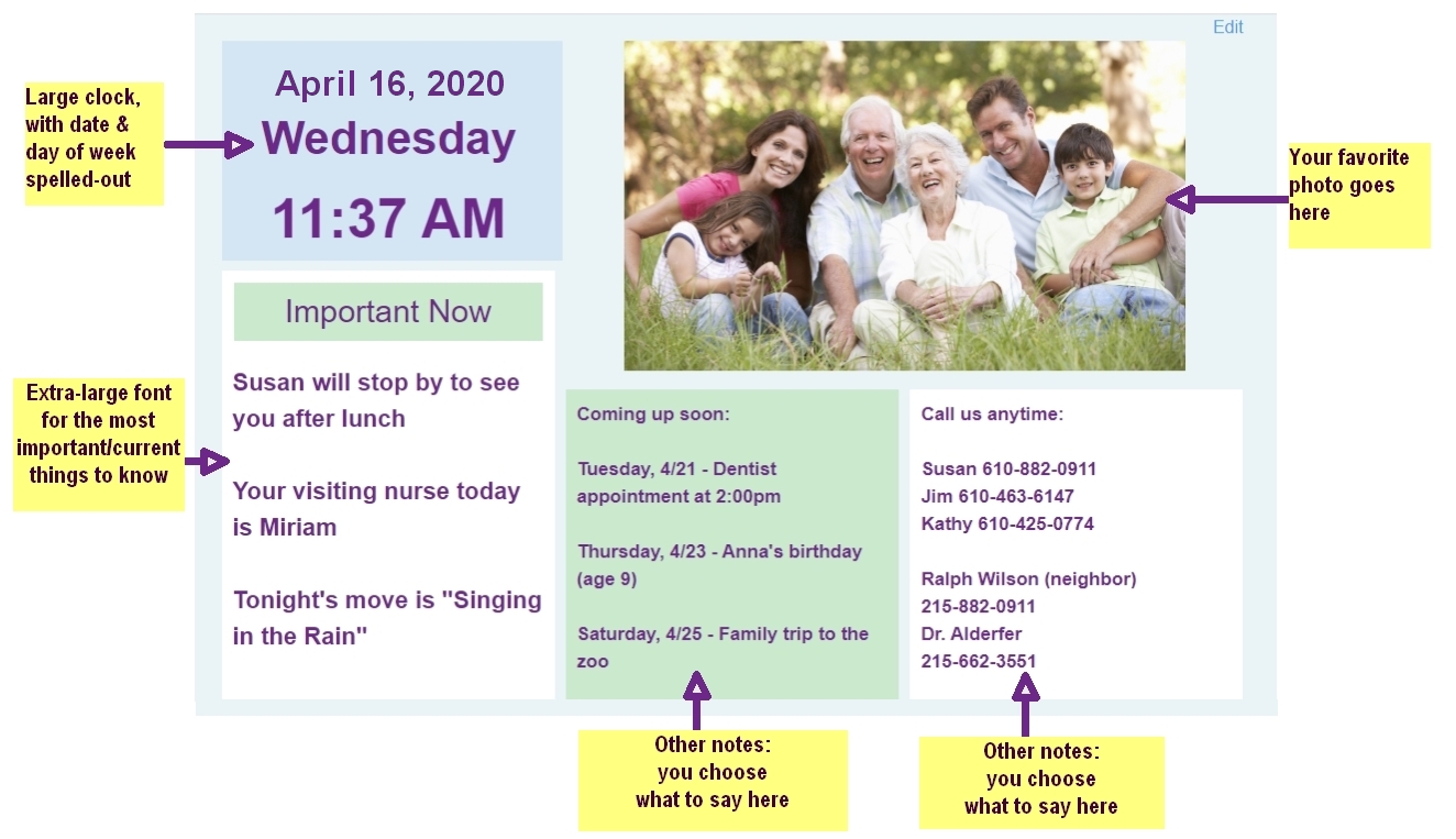 At 155words.com, this online 'whiteboard' is easily updated anytime, from any smartphone or computer. It also includes an elderly-friendly clock, and familiar photo.